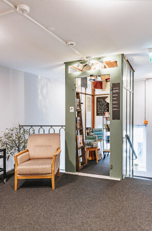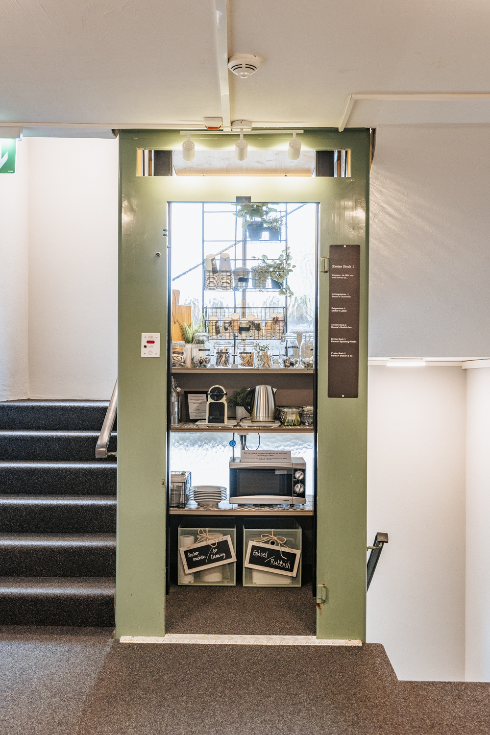 Seit kurzem gibt es im alten Fahrstuhl in der 1. Etage eine kleine Tee-& Kaffeeküche. Nach Herzenslust dürfen sich unsere Gäste 24h mit einem Espresso oder einem feinen Tee bedienen. Ganz praktisch ist auch die dort vorhandene Mikrowelle.