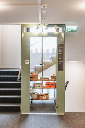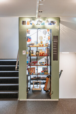 Das Gebäude wurde 1954 erbaut. Beim Umbau im 2019 wurde vom 70 jährigen Fahrstuhl-Gehäuse die Liftkabine entfernt. Der leere Fahrstuhl-Schacht wurde mit neuen Zwischenböden auf jeder Etage ergänzt. Somit sind nun 6 kleine "Gwunder-Nischen" entstanden. Dieses Foto zeigt den Lift noch im alten Original-Zustand.